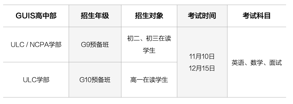 GUIS春季班項目僅開放ULC/NCPA學部G9預備班、ULC學部G10預備班申請。各年級秋季班招生預計于12月啟動,請留意學校官方信息發布。