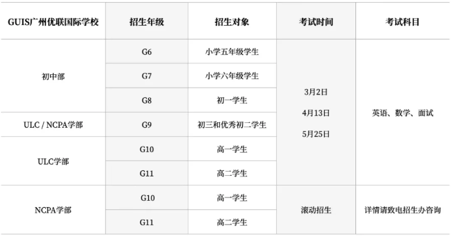ULC學部、NCPA學部G9年級入學考試統一進行,學生可自由填寫志愿申請ULC或NCPA,在符合錄取條件的基礎上,學校根據學生志愿發放錄取。