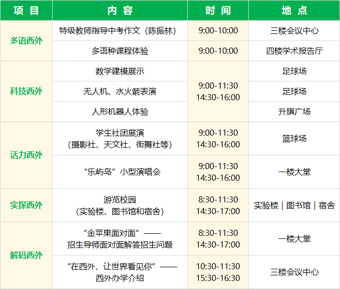 1.現場答疑:5月2日到5月5日,每周的周六、周日,上午9:00-12:00和下午3:00-5:00,都有相應的招生老師為蒞臨西外高中部的家長和學生答疑。