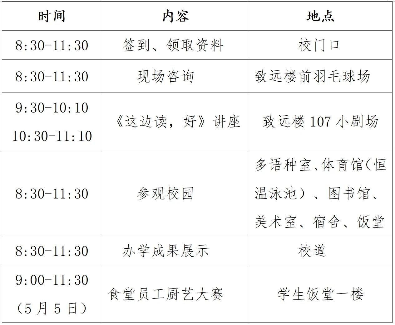 為便于廣大家長了解廣東外語外貿大學實驗中學相關辦學情況和高中招生政策咨詢,學校將于5月5日、11日舉辦校園開放日,具體安排公布如下,歡迎廣大家長和學子來校參觀。