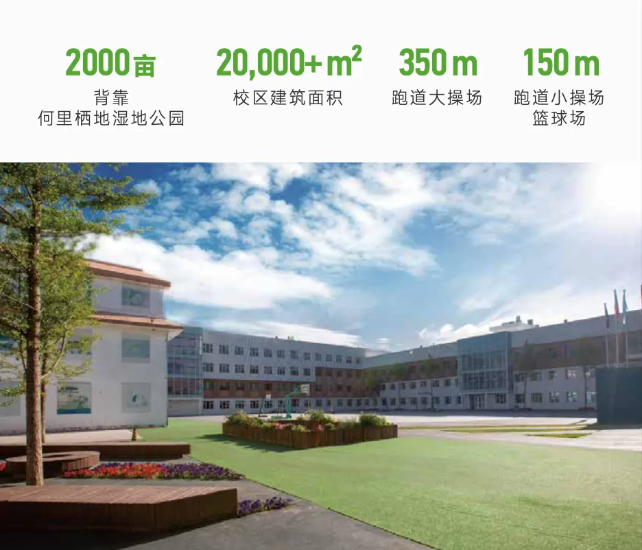 學校坐落于北京市朝陽中央別墅區,毗鄰紅磚美術館,背靠 2000 畝何里棲地濕地公園,交通便利。
