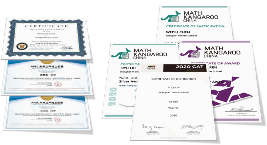 我們收獲了各項國際大賽的大獎:英國物理奧林匹克挑戰賽、加拿大滑鐵盧牛頓物理競賽、北美馴鹿數學競賽、澳大利亞袋鼠數學競賽、加拿大初級化學奧賽、澳大利亞數學思維挑戰(AMC)、歐洲經濟學奧林匹克、APEC未來之聲、聯合國可持續發展目標英語演講比賽、上海市中學生英語演講比賽等。