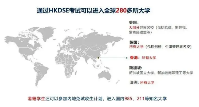 非港籍生也可以用 DSE成績(jī)申請(qǐng)中國(guó)港澳臺(tái)或海外高校,大部分院校無需其他國(guó)際考試成績(jī)證明。