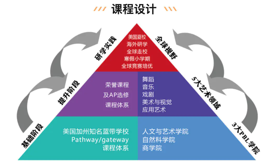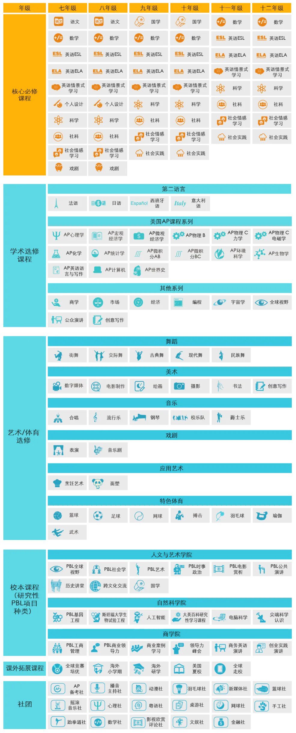 課程設置包括核心必修課程、學術選修課、AP課程、藝術/體育選修課、研究型PBL項目課程、課外拓展課程以及學生社團課。