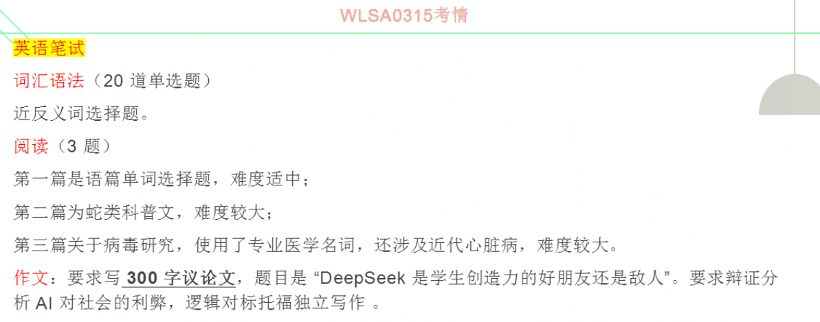 WLSA英語筆試題量較大(語法20題、閱讀2篇(10)、寫作300+),詞匯量要求較高,時(shí)間緊(70mins)