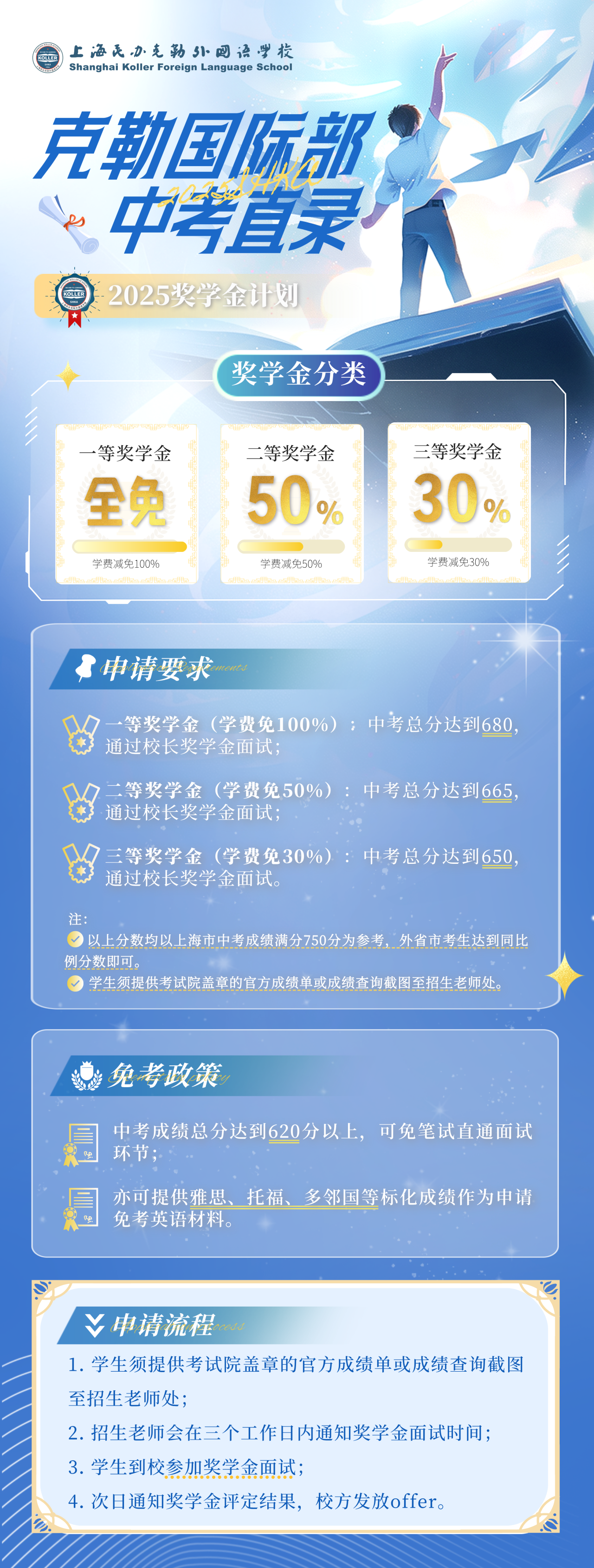 為了鼓勵更多品學兼優的學生加入克勒國際部,我們設立中考直錄&獎學金計劃,學生可憑中考成績單申請我校一、二、三等獎學金。如果你對未來有著清晰的目標,也希望用成績為夢想鋪路,那么現在就是行動的最佳時機。我們將竭盡所能,助你在多元化的學習環境中快速成長,為未來海外升學做好充分準備。