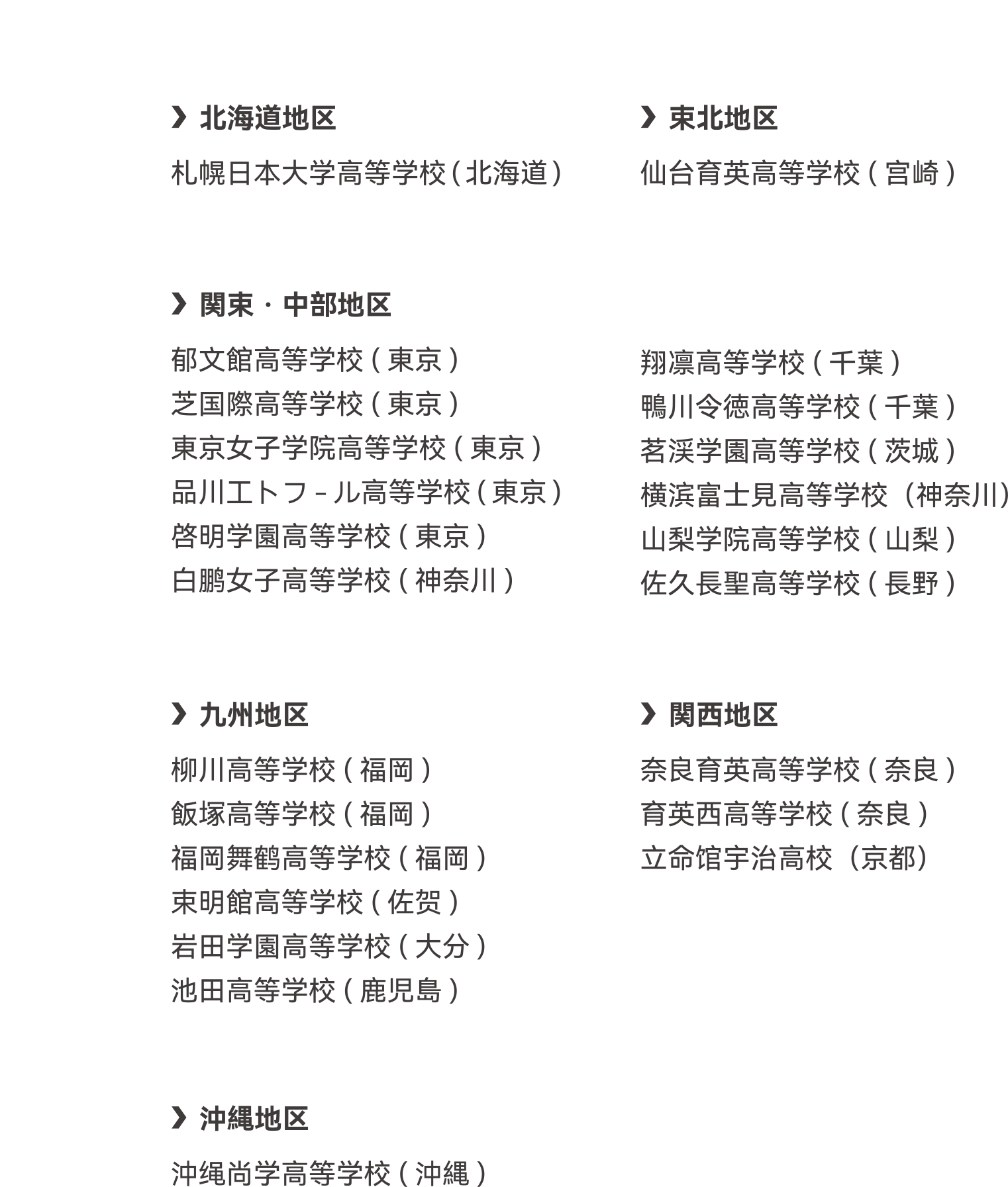 “2+1.5”學(xué)制保證學(xué)生在日高課程班學(xué)習(xí)兩年后,最后一年半的時間進入日本姐妹高中。相應(yīng)高中擁有推薦名額,只要學(xué)生達到一定的標(biāo)準(zhǔn)就可以獲得學(xué)校推薦。學(xué)校有超二十所姐妹高中可選,地理位置覆蓋了日本各主要地區(qū),為學(xué)生赴日留學(xué)提供了便利和保障。