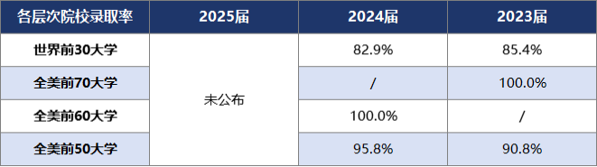 2023-2025屆每年均收獲2-3所全美前30院校(有兩屆收獲了北卡教堂山、佛羅里達大學)的錄取,其2024屆收獲了排名前十的西北大學錄取;